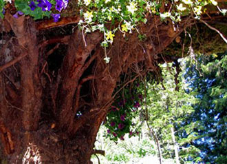 Те деревья, которые после разрушительного оползня остались целыми, Стив Боухей закопал в землю, а в корнях оборудовал природные цветочные клумбы-горшки, в которые высадил яркие фуксии, бегонии и петунии. На сегодняшний день в ботаническом саду Glacier Gardens встречается несколько сотен таких "перевернутых" деревьев, корни которых мастерски украшены мхом и яркими цветами.