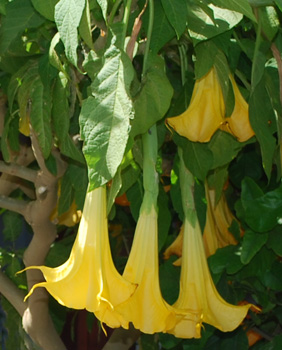 Свое второе название, «Ангельские трубы», бругмансия получила из-за формы своих удивительных цветов. Они напоминают свесившиеся вниз граммофончики длиной до 40 см самых разнообразных цветов (от нежно-розовых до ярко оранжевых и фиолетовых). Лепестки бругмансии бываю простые, махровые, встречаются даже двухуровневые лепестки. Эти цветы источают чарующие, божественные ароматы. Но не стоит ими увлекаться. Есть поверье о том, что заблудившись в зарослях бругмансии, можно навсегда потерять рассудок. Волнующие ароматы этих цветов уносят твое сознание в мир грез и мечтаний, и назад уже дороги нет. Кстати, еще одно название бругмансии, совершенно противоположное, – «цветок демона».