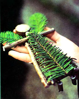 Для того, чтобы собрать ваш оберег, вам потребуется проволока и клей. Начните с головы, шеи и рук: с помощью проволоки, продетой в просверленные отверстия, свяжите их вместе: шея должна располагаться ровно посередине палочки - заготовки рук, а голова должна крепиться прямо над шеей. Все элементы каркаса - четыре заготовки для боковых планок и одну коротенькую основу сложите вместе в форме треугольника: из двух длинных веточек и основы с помощью термостойкого клея сделайте треугольник. Дайте заготовке просохнуть и наклейте сверху еще две планки: на вершине треугольника они должны сойтись вместе с основным, а возле основы отступите от углов на 0,5 см к середине. Таким образом, тело вашего ангела станет более объемным. Оставьте заготовку сохнуть около 12 часов, а потом приступайте к окончательной сборке. С помощью проволоки вершину треугольника прикрепите к заготовке рук и головы, а к основанию привяжите две маленькие ножки (постарайтесь, чтобы палочки остались свободно движущимися и как бы болтались на основе). Возьмите крупную веточку ели или пихты, отмерьте от края длину тела ангела и обрежьте. Предварительно нанесите на обратную сторону ветки клей и приложите к заготовке (кончик ветки должен совпадать с основанием шеи, а более широкая хвоя лечь по нижнему основанию треугольника-корпуса). Ваше пушистое зимнее одеяние готово. Две веточки хвойного поменьше (около 6-7 см) расположите "за плечами" ангела, образовав игольчатые крылья. Закрепите их при помощи проволоки. Если вы хотите дополнительно украсить ваш оберег, покройте его снегом или серебрянкой при помощи аэрозоля, добавьте блестки, кружево или нимб.